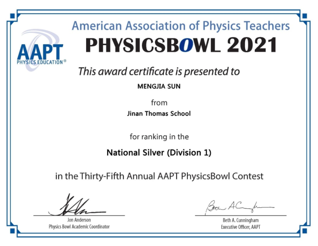 在ASDAN中国(阿思丹学院)举办的第35届“物理杯”美国高中物理思维挑战中,游鹏宇同学获得区域前10,全国金奖;孙孟嘉同学获得全国银奖。指导教师丁杨被授予“优秀指导教师”荣誉称号。