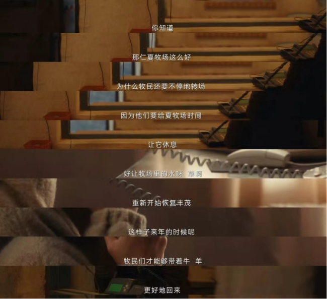 剧中曾有这样一段对话:“夏仁牧场这么好,为什么牧民还要不停的转场?因为他们要给夏牧场时间让它休息,好让牧场里的水呀草啊,重新开始恢复丰茂。”