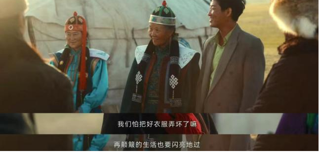 在剧中有一幕,牧民们要迁移转场,因为担心路途遥远,天气莫测会把好衣服弄坏,张凤侠穿了一身不太体面的破烂衣服,朝戈的奶奶见此情景说:“再颠簸的生活,也要闪亮地过呀。”