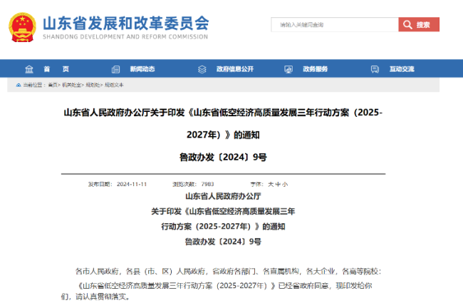 山东省人民政府办公厅印发《山东省低空经济高质量发展三年行动方案(2025-2027年)》的通知截图