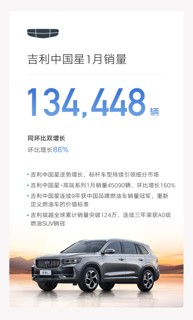 吉利汽车1月销27万辆同环比双增长,新能源销量及海外出口量双爆发