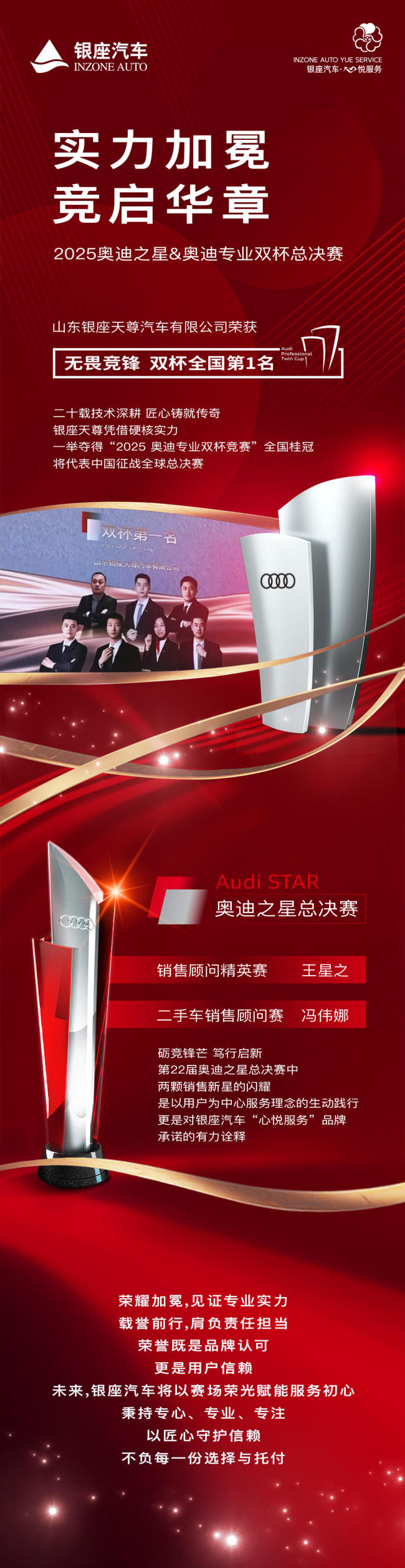 3月25日,2025奥迪专业双杯竞赛总决赛与第22届奥迪之星总决赛在北京圆满落幕。银座汽车旗下天尊奥迪团队凭借过硬实力,在激烈的全国角逐中脱颖而出,斩获售后服务最高荣誉“2025奥迪专业双杯竞赛”全国第一名,并将作为中国代表出征全球总决赛;同时在“奥迪之星”赛事中勇夺销售精英与二手车销售精英双料殊荣。