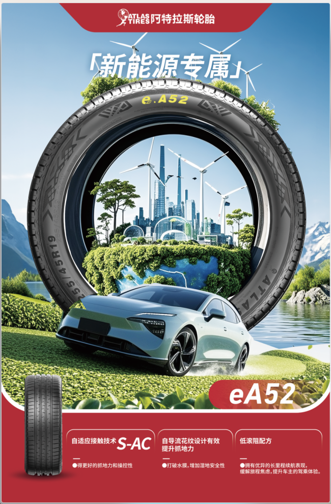 面向新能源时代的到来,阿特拉斯e.A52应运而生。这是专为高端新能源汽车开发的低滚阻、强操控、静音舒适型轮胎,全面提升电动车辆的驾乘体验与性能表现。