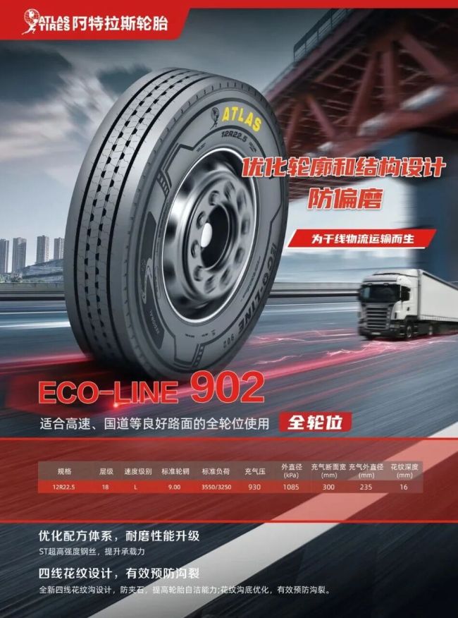 作为阿特拉斯商用车轮胎的明星之作,ECO-LINE 902专为中长途干线运输量身打造。其出色的耐磨表现与稳定的安全性能,赢得广大卡友的信赖,成为“阿特拉斯卡友之家”当之无愧的标杆产品。