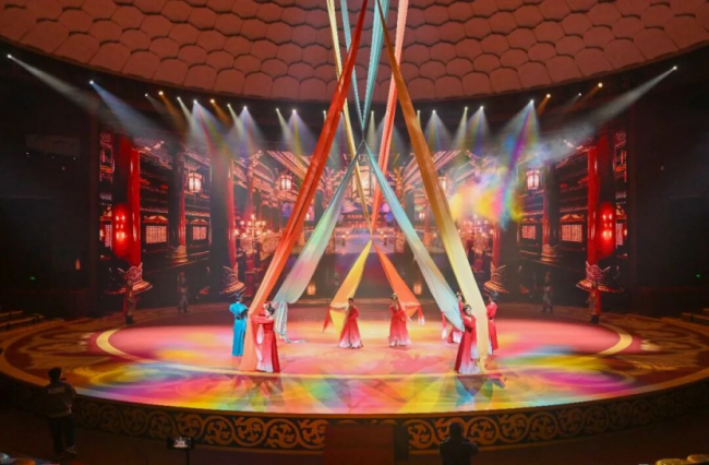 泰名尔集团以专业能力深度参与创意策划、场景设计、服化道设计、演艺编排、技术执行全链条服务,依托福寿宫硬件优势,联动穹顶投影、纱幕升降、地面投影、环绕立体声、干冰云雾、彩帛特效等多媒体与舞台技术,构建360°全景沉浸剧场,实现时空流转、虚实共生的沉浸式观演效果。