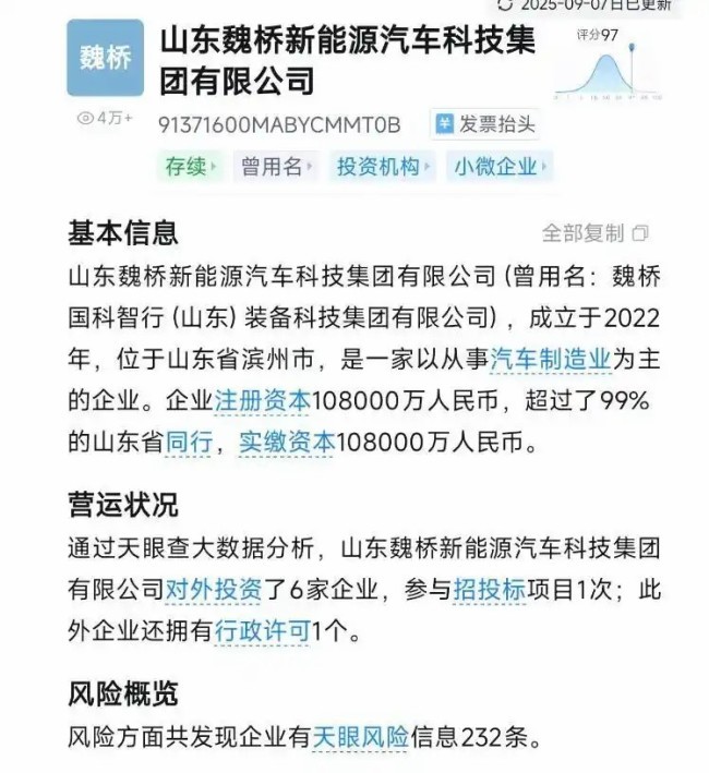 作为北汽制造如今的实际控制方,山东魏桥新能源汽车科技集团有限公司背景不凡。该公司成立于2022年9月,是魏桥创业集团重点打造的新能源产业板块,旗下有极石、212越野车、锐胜等品牌。天眼查数据显示,其对外投资6家企业,现存232条企业风险信息。
