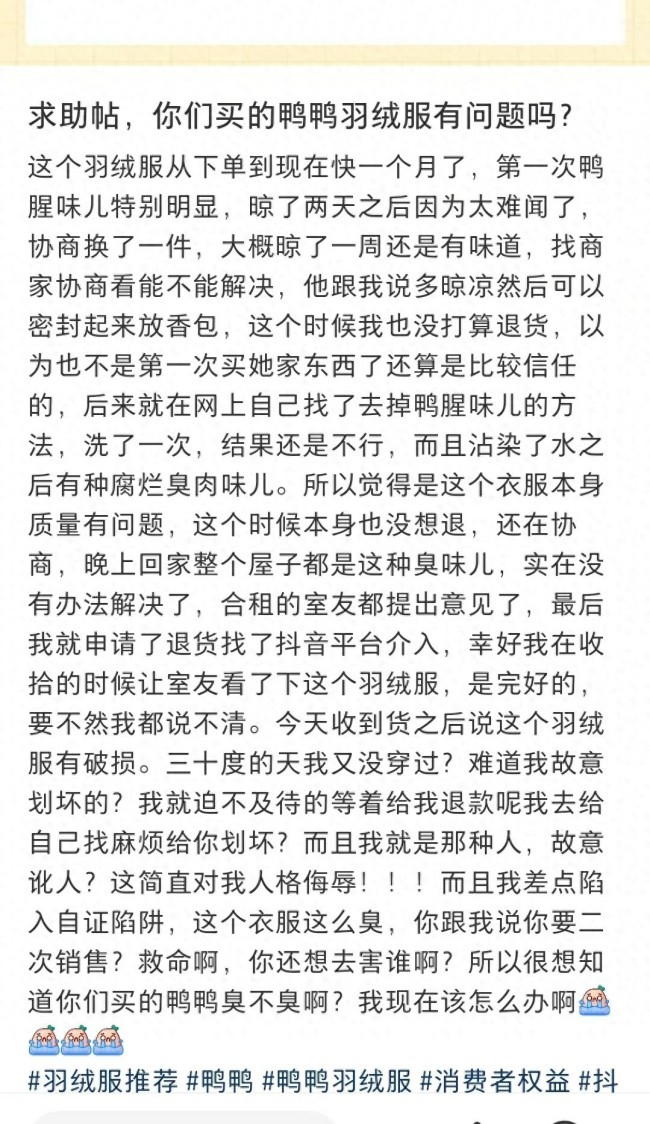 虽说羽绒服初期可能带点鸭绒天然的味道,但味道重到影响穿着,往往是清洗不彻底、绒子等级低或是存储不当的信号,这难免让消费者对品控打上问号。