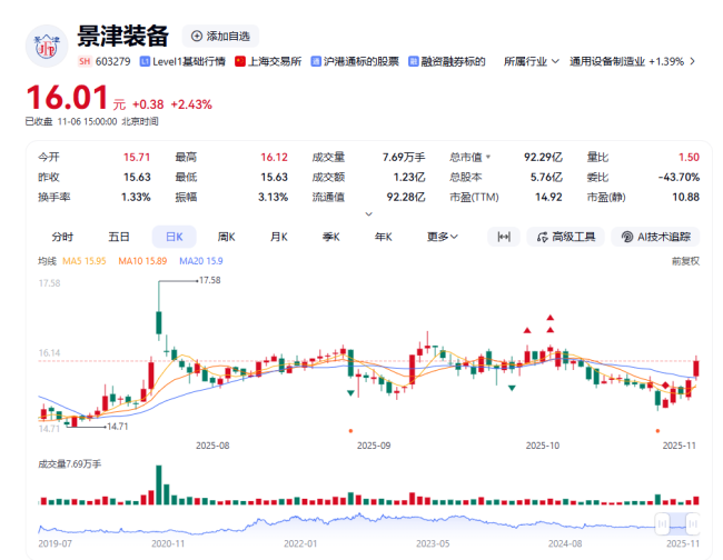 景津装备11月6日报涨2.43%,最新市值92.29亿元。
