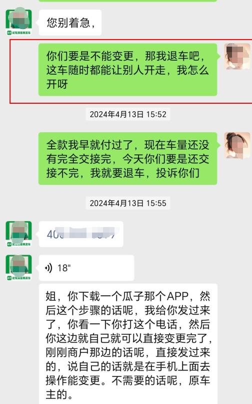 金女士与瓜子二手车工作人员的沟通记录
