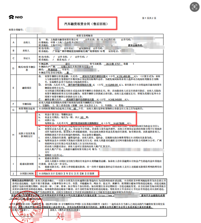 在中国人民银行征信中心动产担保登记证明上写着,该车辆的所有权人为上海蔚来融资租赁有限公司,租金计算方式为等额租金法,共60期。