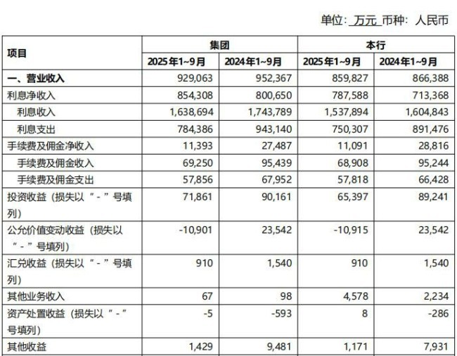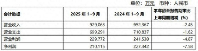 2025年1-9月,该行实现营业收入92.91亿元,同比下滑2.45%;实现净利润21.01亿元,同比降幅扩大至7.58%。