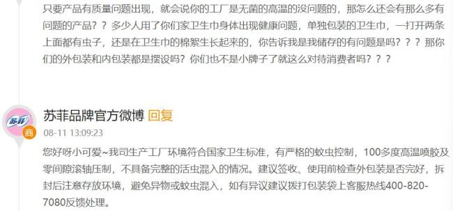 还有消费者反映,“我4月份购买的一箱苏菲卫生巾中,有一包单独包装的安睡裤(内含两条),打开后发现安睡裤内侧和内包装上都有虫子,且虫子已与棉絮缠绕在一起,明显是从产品内部生长出来的,这样的产品质量实在令人恶心。”针对该问题,客服回应称,“不具备完整的活虫混入的情况。”对此,该消费者反驳道,“只要产品出现质量问题,品牌就宣称工厂无菌、经过高温处理没问题,那为何还会有这么多问题产品?单独包装的卫生巾,一打开两条都有虫子,还藏在棉絮里,难道说是我储存不当?你们的内外包装都是摆设吗?作为知名品牌,就是这样对待消费者的?”
