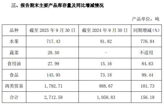 从公司经营数据看,今年前三季度,占营收大头的水果产量和销量分别下滑2.34%和3.06%,而第三季度数据更加难看,产量和销量分别下滑25.55%和28.23%。库存方面,主要产品都出现了库存大幅增加。数据显示,前三季度,公司的水果库存量同比增长776.84%,肉类贸易库存量增长101.73%,食品库存量增长99.44%,食用油库存量增长84.63%。