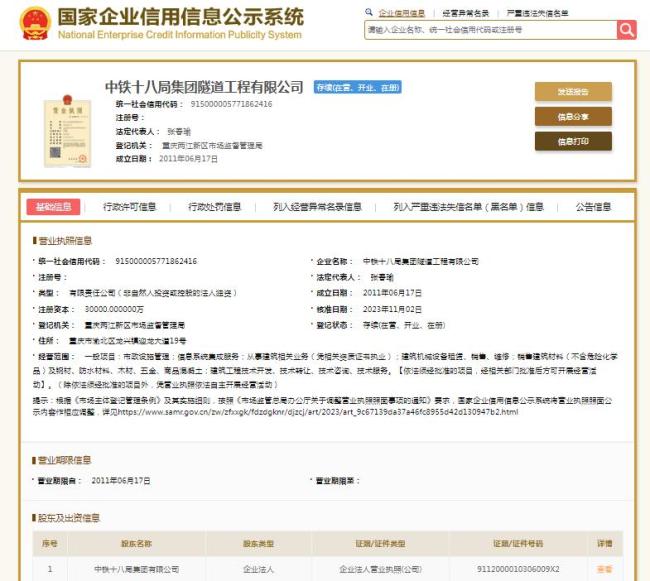 国家企业信用信息公示系统显示,中铁十八局集团隧道工程有限公司成立于2011年,法定代表人张春瑜,注册资本30000万元人民币,由中铁十八局集团有限公司全资持股。