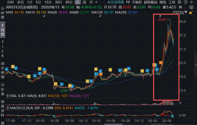 操纵期间,金城医药股价呈先“下跌”后“上涨”趋势,其间股票最低点出现在2018年10月,为12.87元/股,最高点出现在2019年9月,为22.63元/股。值得注意的是,在2020年5月,金城医药迎来一波大涨,仅仅2个月时间,其股价累计最大涨幅超过120%。截至2025年12月12日,该公司收盘价为14.73元/股,总市值约56.54亿元。