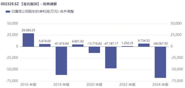 最近几年,皇氏集团的业绩不佳,营收方面,经过多年规模扩张后,2024年出现断崖式下滑,下滑接近三成。归母净利润方面,最近7个年度出现4年亏损。公司2018年突然巨亏6.16亿元,2019年扭亏后,2020年和2021年再次陷入亏损状态,分别亏损1.37亿元和4.72亿元,2022年和2023年回正后,2024年再次出现大幅亏损,亏损额6.81亿元,这4年亏损总额超19亿元。