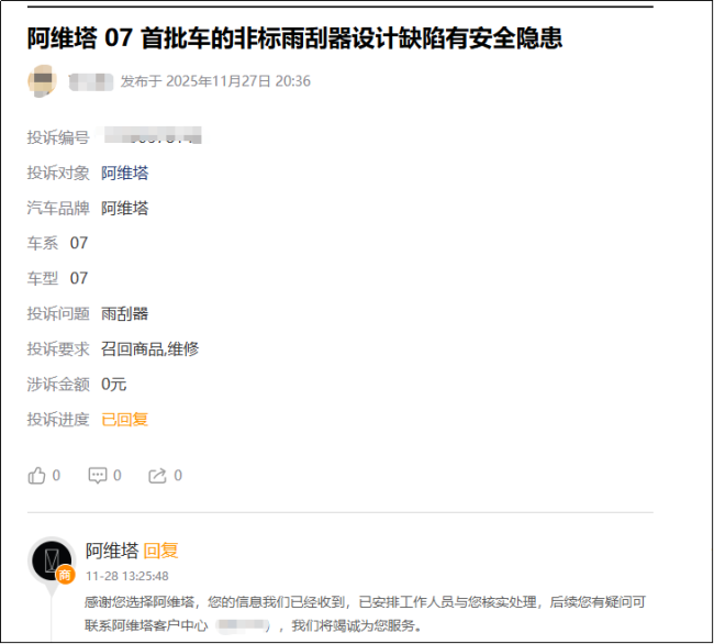 记者获悉,有消费者购买“阿维塔07”后发现,首批车的雨刮器为非标接口,拆卸困难,市面上无通用备品,阿维塔商城售价为市面价格五倍以上,且长期缺货,对车主行车安全造成了巨大隐患。