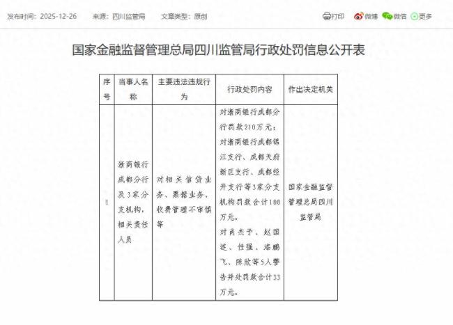 年末常态化监管工作稳步推进,合规整改与惩戒履职从未缺位。12月26日,浙商银行(601916)再添一张罚单,四川金融监管局披露的行政处罚信息显示,浙商银行成都分行因信贷业务、票据业务、收费管理等多项业务不审慎,被处以210万元罚款,2025年处罚记录再添一笔。