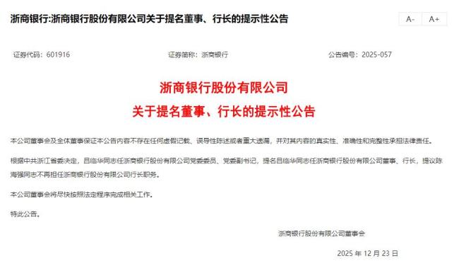 12月5日,浙商银行发布公告,公司董事会审议通过了《关于选举浙商银行第七届董事会董事长的议案》,选举陈海强为浙商银行第七届董事会董事长,任期与第七届董事会任期一致。12月23日进一步发布提示性公告,根据中共浙江省委决定,吕临华任该行党委委员、党委副书记,被提名董事、行长职务,同时提议陈海强不再担任行长职务。