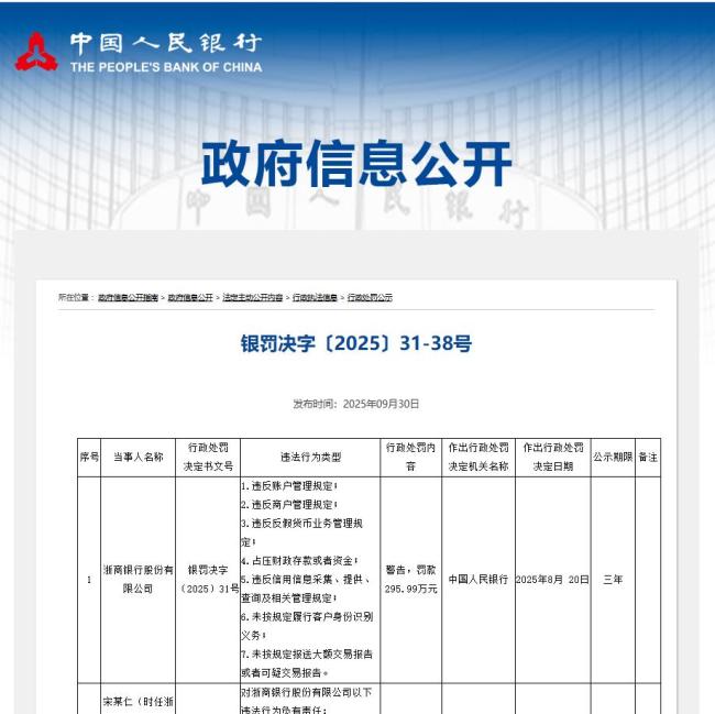 9月30日,中国人民银行的行政处罚公示再添新罚,浙商银行因存在违反账户管理规定、违反商户管理规定、违反反假货币业务管理规定、占压财政存款或者资金等7项违规行为,被警告并罚款295.99万元,7名时任相关责任人同步领罚。