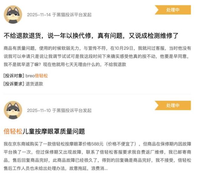 与此同时,在第三方消费者投诉平台,颈部按摩仪、眼部按摩仪等多款产品被投诉,问题主要集中于涉及产品存在质量问题不予维修,售后服务态度差、使用产品后致使受伤以及虚假宣传等。
