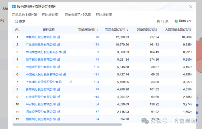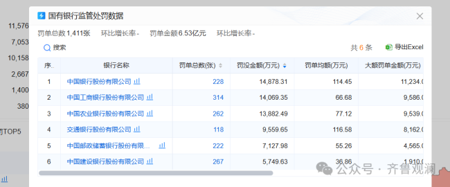 根据罚没款金额排名,罚没款金额超过1亿元的银行有5家。分别为中国银行被罚1.49亿元,工商银行被罚1.41亿元,农业银行被罚1.39亿元,华夏银行被罚1.21亿元,广发银行被罚1.10亿元。