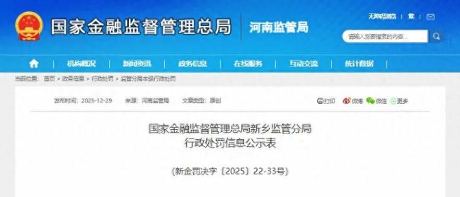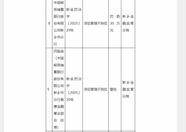 近日,国家金融监督管理总局新乡监管分局发布行政处罚信息公示表,中国邮政储蓄银行股份有限公司新乡市分行因“贷后管理不到位”,被处以30万元罚款;该行普惠金融事业部总经理闫振宙同时被给予警告处罚,罚单文号分别为新金罚决字〔2025〕29号、30号。