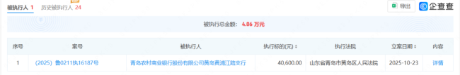 2025年10月23日,青岛农商银行黄岛黄浦江路支行也被法院列入被执行人,被执行标的4.06万元。该行的历史被执行人信息多达24条,被执行总金额2.05万元。