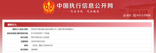 据中国执行信息公开网显示,2025年11月6日,青岛农商银行北宅支行被青岛市崂山区人民法院立案执行,被执行标的36.81万元,案号为(2025)鲁0212执9323号。