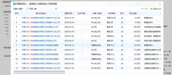 平安人寿内蒙古分公司紧随其后,该公司被查获“欺骗投保人、被保险人或受益人”等多项违法违规行为,受到警告并罚款66万元处罚。