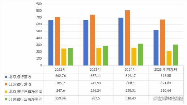 早在2022年,城商行老二江苏银行以705.7亿元的营收、253.86亿元的归母净利润水平,超过北京银行的662.76亿元、247.6亿元,首次实现盈利能力上的超越。
