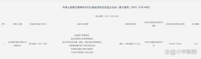 就在本次被罚数日前,11月20日,北京银行深圳分行因违反银行账户及支付结算管理规定被警告并罚款180.1万元。