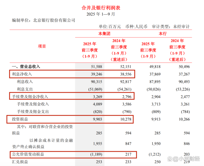 但在投资业务上,2025年前九月,北京银行的投资收益为99.03亿元,同比减少3.75亿元,下降3.6%;公允价值变动收益为-11.89亿元,较上年同期的2.17亿元减少14.06亿元,在三季度债市波动的背景下,投资业务反而成为北京银行业绩的拖累。