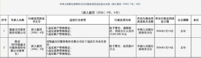 2026年开年,支付行业收到首张千万元级别的大额罚单。日前,中国人民银行深圳市分行公示一则行政处罚决定信息公示表,银盛支付服务股份有限公司(以下简称“银盛支付”)因“违反商户管理规定、违反清算管理规定、违反账户管理规定”,被监管给予警告、通报批评,罚没1584.17万元。