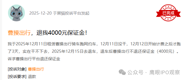 在黑猫投诉平台上,关于曹操出行的投诉更是涵盖司乘两端:乘客端集中反映价格虚高、司机危险驾驶平台不作为、司机不按规定路线行驶等问题;司机端则以平台乱扣费、不退还押金(保证金金额多为4000-6000元不等)为主要诉求。