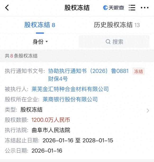 天眼查信息显示,本次所冻结股权的持有者莱芜金汇成立于2000年1月,主营业务包括有色金属合金销售等。近年来,该公司频繁被列为被执行人,执行标的累计超1.6亿元,除了对莱商银行的持股被冻结,该公司对济南市钢城区汇锋小额贷款有限公司的持股也被冻结300万人民币。