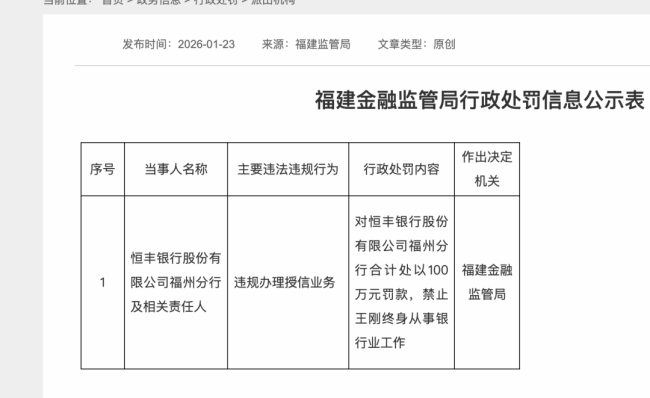 1月7日,国家金融监督管理总局东营监管分局披露,恒丰银行东营分行因内控管理不到位被罚,时任分行行长王刚被禁止从事银行业工作15年;1月23日,福建金融监管局发布行政处罚信息,追溯认定恒丰银行福州分行违规办理授信业务,王刚被处以终身禁业。(文件截图在文末)