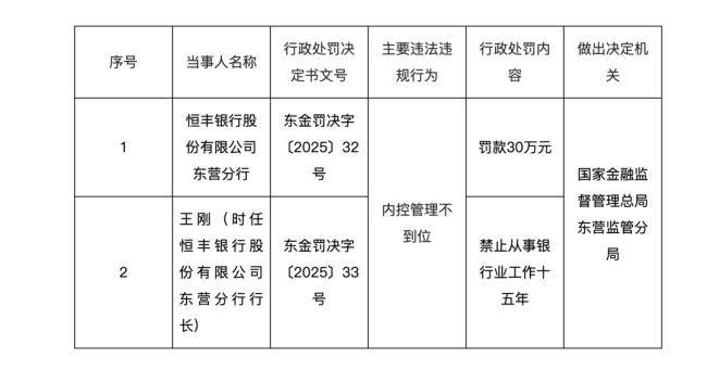 而在山东东营,监管关注的重点转向分行内控层面。2025年1月7日披露的处罚显示,恒丰银行东营分行存在内控管理不到位问题,分行被罚30万元,王刚作为时任行长被处以15年行业禁入。工商信息显示,其已于2016年6月退出东营分行法定代表人序列,但监管问责并未因职务变动而中断。