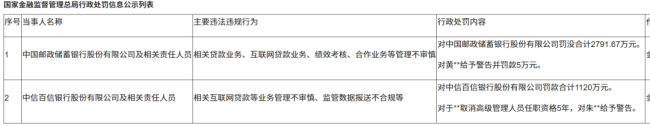 最大的一笔罚单为2025年9月末,邮储银行因“相关贷款业务、互联网贷款业务、绩效考核、合作业务等管理不审慎”,被罚没合计2791.67万元。同时,责任人黄文贤被给予警告并罚款5万元。