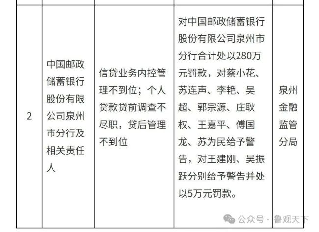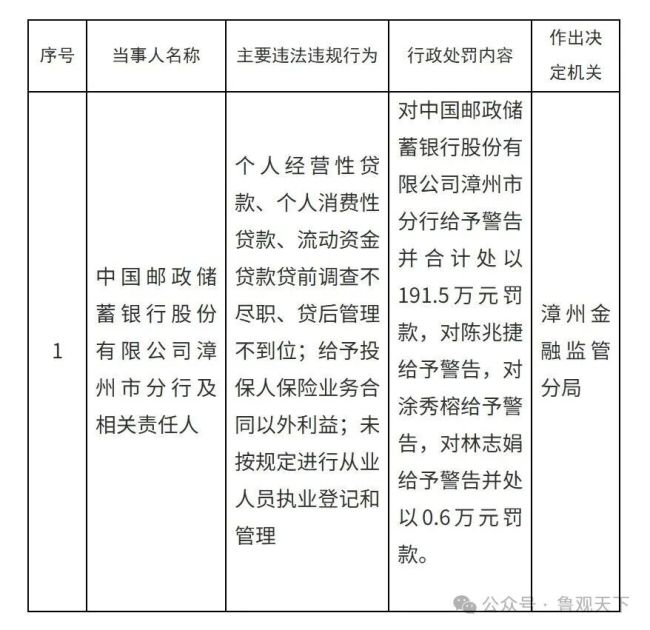 这场罚单风暴的覆盖范围横跨华南、华东、华中三大区域,涉及的违规行为既存在共性问题,又各具业务特色。共性方面,"贷前调查不尽职""贷后管理不到位"成为高频词汇,5张罚单中均有提及,凸显出邮储银行信贷全流程管控的系统性漏洞。个性问题则呈现业务多元化特征:广州分行涉及存贷款业务违反审慎经营规则、违规收费;郑州分行被查出办理无真实贸易背景的信用证及福费廷业务,固定资产贷款与流动资金贷款均出现挪用情况;漳州分行除信贷管理问题外,还存在保险业务违规、从业人员执业登记不合规等跨界问题;河南直支行则在信贷资金监控、中间业务收费等方面触碰监管红线。