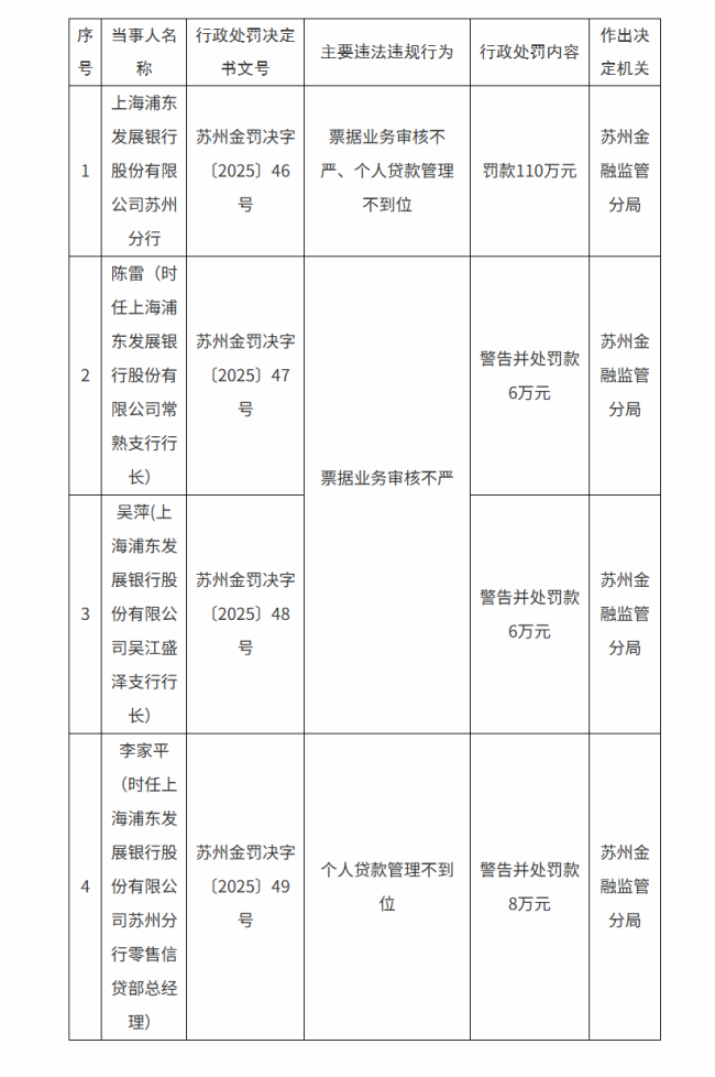 罚单显示,因为票据业务审核不严、个人贷款管理不到位主要违法违规行为,国家金融监督管理总局苏州监管分局对浦发银行苏州分行罚款110万元;对陈雷(时任上海浦东发展银行股份有限公司常熟支行行长)警告并处罚款6万元;对吴萍(上海浦东发展银行股份有限公司吴江盛泽支行行长)警告并处罚款6万元;对李家平(时任上海浦东发展银行股份有限公司苏州分行零售信贷部总经理)警告并处罚款8万元。