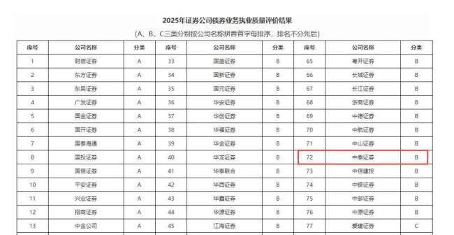 近期,中国证券业协会网站公布的2025年证券公司投行业务质量评价结果和债券业务执业质量评价结果显示,中泰证券股份有限公司(简称“中泰证券”)这两项业务的执业质量评价结果均被降级为B类。此前,该公司2024年这两项业务的执业质量评价结果均为A类。
