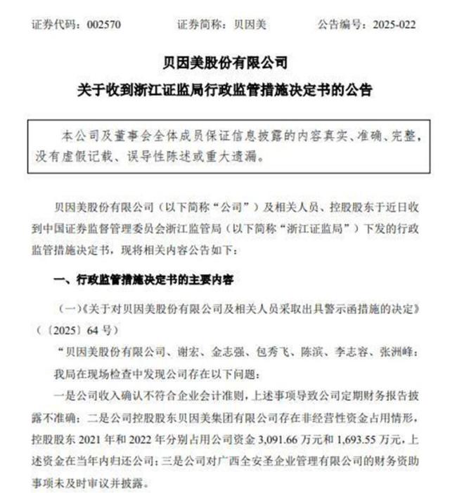 公司治理的规范性问题进一步加剧了企业的经营困境。2025年4月,浙江证监局对贝因美出具警示函,揭露其存在多项违规:除了控股股东在2021~2022年非经营性占用上市公司资金合计4785.21万元外,还包括收入确认不合规、财务资助未及时披露等问题,董事长谢宏等多名责任人被记入诚信档案。