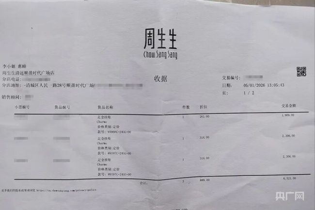 “我今年1月5日在广东省清远市清城区远盈时代广场的周生生门店购买的首饰,当时想着品牌大,品质有保障,没想到会出现这种问题。”李女士在接受记者采访时回忆道。据她介绍,当天她和妹妹一同前往该门店,一共购买了三款黄金饰品,其中她个人花费4215元,买了一个足金福袋挂坠(价格2306元)和一个足金小羊挂坠(价格1909元),妹妹则购买了一个同款的足金福袋挂坠。
