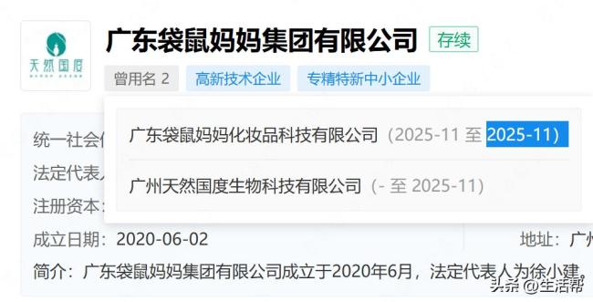 经查,这些产品备案信息对应的企业为广州天然国度生物科技有限公司;企查查信息显示,该企业已于2025年11月更名为广东袋鼠妈妈集团有限公司,法定代表人为徐小建,公司位于广东省广州市增城区,注册资本9亿元,实缴资本亦为9亿元。