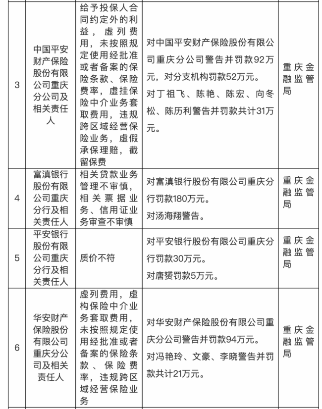 中国平安财产保险股份有限公司重庆分公司除违规跨区域经营外,还存在给予投保人合同约定外利益、虚列费用、未按规定使用经批准或备案的保险条款和费率、虚挂保险中介业务套取费用、虚假承保理赔、截留保费等多项违规行为,被警告并罚款92万元,对相关分支机构罚款52万元,多名责任人合计被罚31万元。