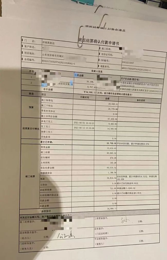 “我从2017年就开始和金螳螂济南门店合作,当时还是直营店,我负责水电、瓦工等基础装修。”唐先生告诉记者,合作初期他按要求缴纳3万元保证金,2018年保证金上调至5万元,剩余部分从施工利润中扣除,加上每个项目扣留的质保金,累计达8万至10万元。