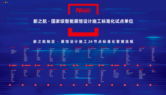 新之航全面推进落实国家标准化创新发展试点工作以来,全面落实国家市场监管总局、国家标准委和省委省政府部署要求,发挥行业领军优势、创新突破,以标准化为引领,筑基领航,研发的中国4.0展馆设计施工标准,首次统一了行业分类标准,规范了设计施工标准,明确了行业发展方向;创新研发的“智能展馆·文旅设计施工运营24节点全产业链标准化流程管理”,首次将标准化原理与方法引入智能展馆·文旅“咨询、策划、设计、数字体验设计、智能展项研发、施工、运营”等服务,建立健全并编撰232项智能空间服务相关标准,构建多维度、全产业标准化体系生态。