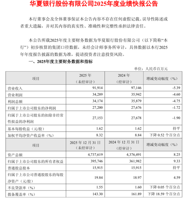 2月13日,华夏银行发布2025年度业绩快报公告。