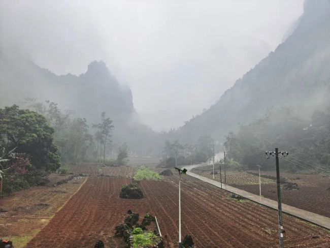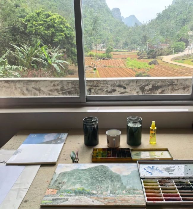 老家是一个美丽的小山村,植被良好,鸟语花香。我在房间里架了一个简陋的画桌,拉了一个大灯泡,白天就在房间里对景写生,晚上根据手机里的素材搞创作。山里气候变化大,今天还是艳阳高照,明天却是云雾缭绕,从窗口望出去,只见山影绰约,树木婆娑,刚犁过的土地呈现深沉的铁红色,一垄垄红土整齐排列,就像壮锦上的图案一般漂亮;没犁过的地里已经长出翠绿的嫩芽,那是去年收获时掉下的种子已经苏醒。山上的小鸟感知到春天的气息,叽叽喳喳地叫个不停,山谷间回荡着欢快的旋律。婶婆已经按捺不住对丰收的渴望,年初一一大早就拉着小推车,在自家地里播种玉米。好一幅《人勤春早图》!